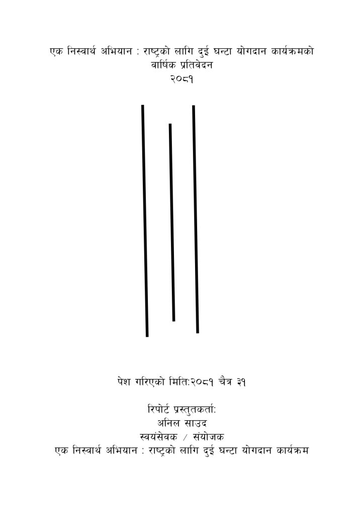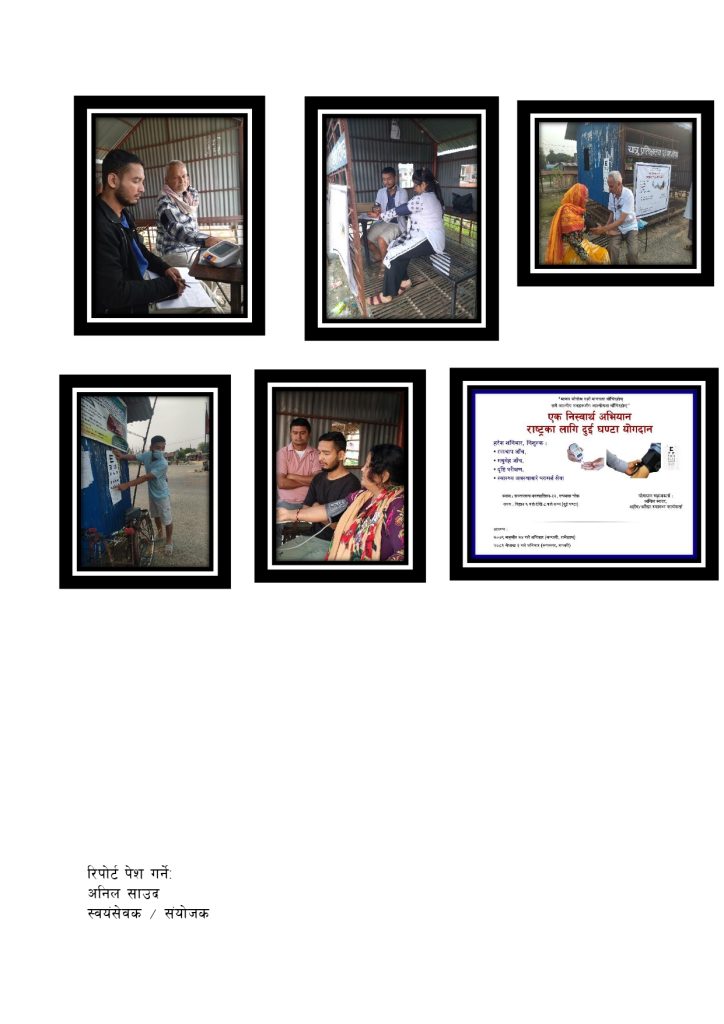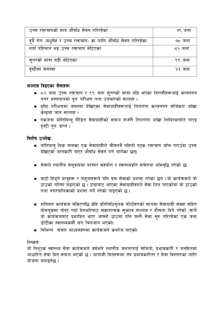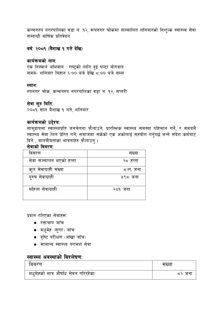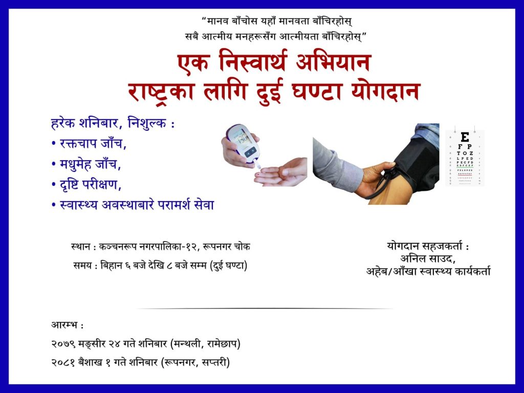 कञ्चनरूप नगरपालिका वडा नं. १२ स्थित रूपनगर चोकमा २०८१ साल बैशाख १ गते शनिबारदेखि सञ्चालनमा आएको ‘एक निस्वार्थ अभियान: राष्ट्रको लागि दुई घन्टा योगदान’ कार्यक्रमको वार्षिक प्रतिवेदन आज औपचारिक रूपमा नगरपालिकाको स्वास्थ्य शाखामा बुझाइएको छ। कार्यक्रम संयोजक अनिल साउदका अनुसार, हरेक शनिबार बिहान ६ बजेदेखि ८ बजेसम्म सञ्चालन हुने यो सेवाले वर्ष भरिमा २८ हप्ता सेवा प्रदान गरेको हो। सो अवधिमा जम्मा ८७९ जनाले सेवा लिएका छन्, जसमा ५९८ जना पुरुष र २८१ जना महिला सहभागी थिए। प्रदान गरिएका प्रमुख सेवाहरूमा रक्तचाप जाँच, मधुमेह (सुगर) जाँच, आँखाको दृष्टि परीक्षण, र सामान्य स्वास्थ्य परामर्श सेवा रहेका छन्। सेवाबाट प्राप्त स्वास्थ्य विश्लेषण गर्दा मधुमेहको मात्र औषधि सेवन गरिरहेका ८२ जना, उच्च रक्तचापको मात्र औषधि सेवन गरिरहेका ७९ जना, दुबै रोगको औषधि सेवन गरिरहेका ७८ जना, पहिलो पटक उच्च रक्तचाप पत्ता लागेका ८२ जना, र सुगरको मात्रा बढी भेटिएका ९९ जना थिए। यी मध्ये धेरै जसो सेवाग्राहीलाई कञ्चनरुप नगर अस्पतालमा थप परीक्षण र उपचारका लागि जान सल्लाह दिइएको छ भने दृष्टि परीक्षणमा समस्या देखिएका सेवाग्राहीहरू मध्ये एक जनाको मोतिबिन्दुको सफल शल्यक्रिया तिलगंगा आँखा शिविर मार्फत गरिएको छ भने अन्यलाई तिलगंगा कञ्चनरुप सर्जिकल आँखा केन्द्रमा थप जाँच गर्न सल्लाह दिइएको थियो ।