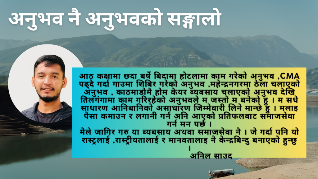 व्यापार दुई महिना चल्यो त्यसपछी तिलगंगामा नाम निस्क्यो । तिम्रो व्यबहार बुझ्दा तिलगंगामा काम गर्नु तिम्रा लागि धेरै नै राम्रो हुनेछ । काम गर्नेहरुलाइ पढाइ पनि दिन्छ देश बिदेश सबै तिर काम गर्न पनि पाइन्छ भनेर मैले सेवा दिने पुर्ब TU डिन तथा न्यायाधीश कनक बिक्रम थापाज्यूले सुझाव दिए पछि मैले आफ्नो कामलाई मैले सुरुमा काम गरेको होम केयर कम्पनिलाइ दिएर तिलगंगाको नियुक्ती लिए । नियुक्ति लिएको हप्ता दिनमै लकडाउन सुरु भयो । यो बिचमा बुबा सङ्गै ठेलामा तरकारी बेच्न महेन्द्रनगरको गाउँ गाउँ पुगे र साझको समयामा छ महिना कंचनपुर रेडियोमा बौद्धिक ज्ञान कार्यक्रम चलाए भने बिहान ट्युसन पढाए जसमा बहिनीहरुलाइ 50% छुटको ब्यबस्था गरेको थिए। लकडाउनले केही तिता मिठा अनुभव भने गज्जबका दिए । एक बर्ष पछि तिलगंगामा फेरि नया नियुक्ति दियो । रामेछाप आएर काम गर्न थाले । के गर्ने हो जिन्दगीमा खास उद्देश्य नभएको म जहिले जे मन लाग्यो त्येही गर्ने म तिलगंगामा काम गर्न थाले पछि एक उद्देश्य बन्यो । ब्यबसाय सङ्गै समाजसेवा गर्ने र सकेको योगदान यो रास्ट्रलाई दिने ।