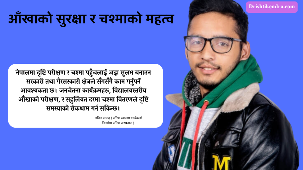 आँखा हाम्रो अमूल्य सम्पत्ति हो। यसको सुरक्षा हाम्रो व्यक्तिगत जिम्मेवारी मात्र होइन, सामाजिक उत्तरदायित्व पनि हो। समयमै आँखाको परीक्षण गरौं, सही चश्मा प्रयोग गरौं, र आँखा सम्बन्धी समस्याहरूलाई गम्भीर हुन नदिऔं।