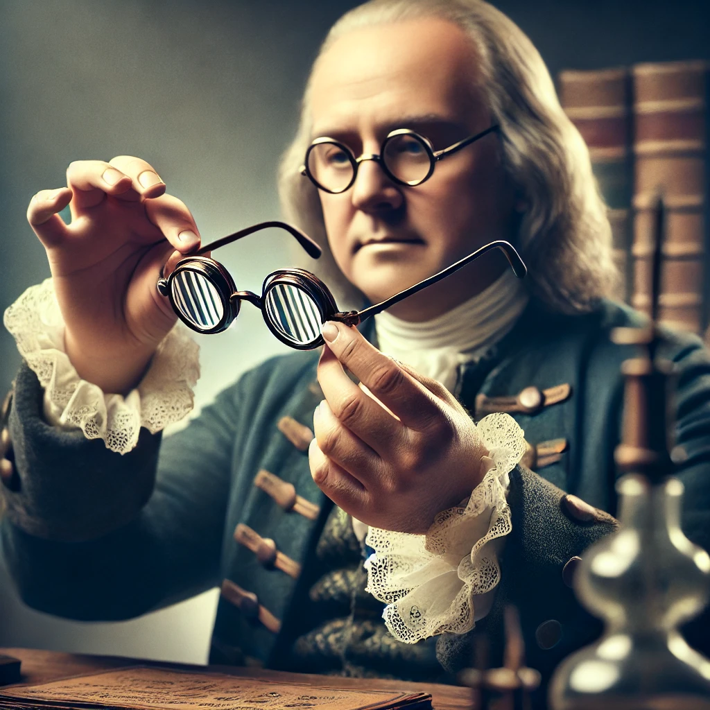 यहाँ बेनजामिन फ्र्याङ्कलिनको ऐतिहासिक तस्बिर प्रस्तुत गरिएको छ, जहाँ उनले आफ्नो आविष्कार, बिफोकल चश्मा, हातमा समातेका छन्।