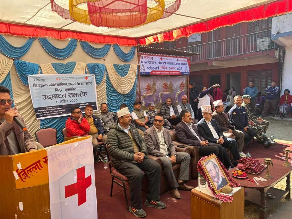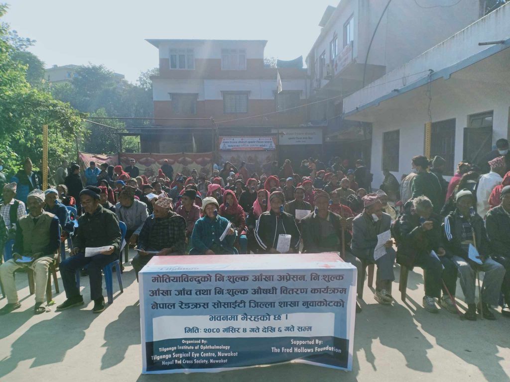 तिलगंगा आँखा प्रतिष्ठान ,तिलगंगा सर्जिकल आँखा केन्द्र नुवाकोट र रेडक्रस सोसाइटी नुवाकोट शाखा को आयोजना र फ्रेड हलोस फाउन्डेसनको सहयोगमा रेडक्रस सोसाइटी जिल्ला शाखा नुवाकोटको भवनमा मिति 2080 मंसिर 4 गते देखि 6 गते सम्म सन्चालन भएको थियो । यस आँखा शिबिरलाई मध्यनजर गर्दै नुवाकोट जिल्ला भरी बीस ठाउमा मोतियाबिन्दु छनोट शिबिर सन्चालन भएको थियो । यस शिबिरमा 1751 जनाले आँखा जाँच गरेको र 213 जनाको मोतियाबिन्दुको शल्यक्रिया गरिएको जानकारी तिलगंगा सर्जिकल आँखा केन्द्रका इन्चार्ज तारा बहादुर वाइबाज्यूले जानकारी दिनुभयो ।